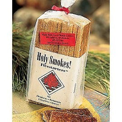 Holy Smokes Firestarters are made from 100% recycled materials. Melted Wax from used church candles is blended with recycled wood fiber to produce a pleasant smelling firestarter. And they burn even when wet!